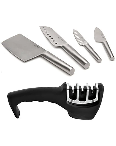- Design details: These knives are made of high quality stainless steel and feature stylish stainless steel handles. Easily sharpened and holds their edge well. The handle is safe, high impact, slip resistant as well as antimicrobial and micro-organism safe. The knife is and low temperature resistant and safe to use in the freezer. Dull knives are a thing of the past! With this handy pull-through sharpener you can sharpen your kitchen knives in 3 simple stages. The diamond surface prepares the knife for sharpening, the tungsten steel restores the cutting edge into a V-shape and the ceramic stone polishes the blade and removes any irregularities. The sharpeners comfort-grip handle with non-slip base ensures extra stability. Set includes: (7″) Santoku knife with holes, (5″)Santoku knife grooved, (4 1/2″) Santoku knife, (7″ x 3 1/2″) cleaver, 8″ 3 in 1 sharpener.