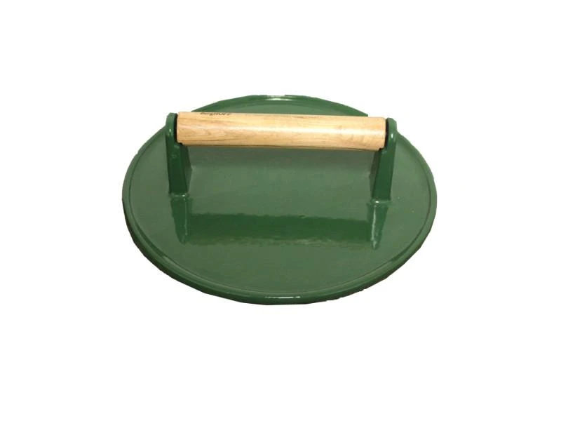 This 9″ Green Cast Iron Steak Press is made of heavy-duty cast-iron base has a hammered finish. You’ll appreciate the stay-cool bamboo handle. This handy cast-iron grill press is coated with vegetable oil and cured at high heat to allow the oil to deeply penetrate the cast iron. It comes pre-seasoned and ready to use right out of the box.