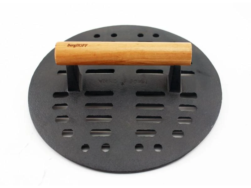 This Cast Iron Slotted Steak press is made of heavy duty cast iron with hammered finish. Cast iron is known for it’s durability. The slotted steak press allows for air flow, while perfectly searing steak on each size at once. Also great for paninis.