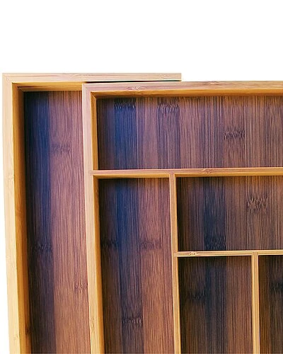 - 8-Slot organizer – All the right spaces for flatware in renewable bamboo. Adjustable tray expands to fit almost any kitchen drawer and includes two additional dividers to customize the compartments to 8 trays. TRAYS NOT EXTENDED MEASURES: 1st Top: 11.25″ x 2.75″, 2nd Top: 8.25″ x 2.75″ – 4 Middle Slots – Left (1): 13.5″ x 2.75″, (2): 10.75″ x 2.5″, (3): 10.75″ x 2.5″, (4): 10.75″ x 2.5″ . SIDE TRAYS EXPANDED MEASUREMENTS: LEFT Exp Side – 17.25″ x 3″ – 1st Top: 11.25″ x 2.75″, 2nd Top: 8.25″ x 2.75″ – 4 Middle Slots – Left (1): 13.5″ x 2.75″, (2): 10.75″ x 2.5″, (3): 10.75″ x 2.5″, (4): 10.75″ x 2.5″ – Right Exp Side – 17.25″ x 3″.