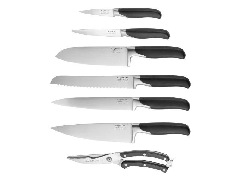 This 8-pc knife block is perfect to cut, slice and dice a wide variety of ingredients with flair. The sturdy knife block in stylish black safely stores 7 high-quality knives with a hand-sharpened stainless steel blade and a black contoured handle that fits your hand like a glove. With the paring knife, utility knife, carving knife, bread knife, chef’s knife, santoku knife and poultry shears the set makes sure you’ve got a knife for every cooking task that’s also easy to maintain and well-balanced to ensure an optimal control. Set includes: 3.25″ Paring Knife, 5″ Utility Knife, 8″ Carving Knife, 8″ Bread Knife, 8″ Chef’s Knife, 7″ Santoku Knife, Poultry Shears, and a Knife Block.