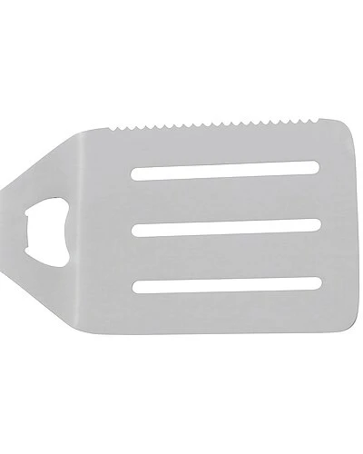 - Flipping a burger, a steak or a larger piece of meat on the grill is a piece of cake with this spatula made of high-quality stainless steel. The serrated edge allows you to test the food for doneness while the head easily slides under the food to turn it or take it from the grill. No need to worry about hand burns thanks to the spatulaÕs long handle that keeps your hands safely away from the grill and is covered in crack-resistant wood. When youÕre not using the spatula you can easily store it within reach with the help of the hook on the handle.