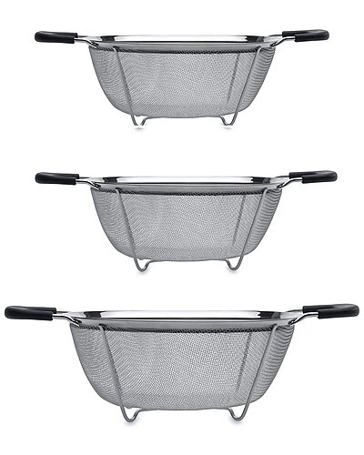 - Thanks to the raised footed base you can use the colander for serving and washing fruits and vegetables, draining, steaming and deep frying. Sturdy welded cross feet provide stability. 18/10 stainless steel provides durability and TPR covered handles are for a sure and safe grip. Set Includes: 7.75″ strainer, 8.75″ strainer, and 10″ strainer.