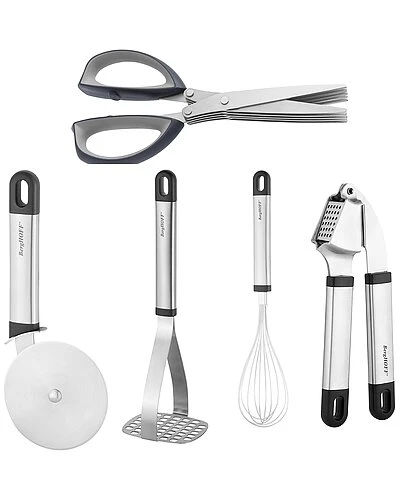 - BergHOFF’s Stainless Steel Tools provide the durability, control, and dexterity the customers love. The Essential Stainless Steel 5pc Tool Set provides you with the tools you need to tackle almost any prep task in the kitchen. Set includes one multi-blade herb scissors, one pizza cutter, one potato masher, one whisk, and one garlic press. Add fresh aromatic garlic to your meals and marinades with the garlic press. Make homemade decadent mashed potatoes with the masher. Easily slice up a homemade pizza with the pizza cutter wheel. Prepare fresh herbs to add to your salads, soups, dips, dressings, and more with the multi-blade herb scissors. Whip up decadent desserts or fluffy omelets with the ergonomic whisk. Made from hygienic stainless steel, the body of the utensils have a satin finish with black ABS accents. Integrated hanging loop for convenient storage options. Handwash recommended.