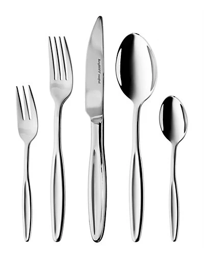 - Whether youre having an everyday family dinner or setting the scene for a festive evening, the Folio flatware gives your table a smart touch. The graceful elongated collar creates a careful contrast with the wider handle and its shapely notch that accompanies your grip. Combining a sleek design with a pleasant feel, designer Ralph Kraemer managed to create a complete set of stainless steel flatware that youll enjoy for years to come. Set Includes: 12 cake forks, 12 dinner forks, 12 dinner knives, 12 dinner spoons, 12 coffee spoons, 2 serving spoons, salad fork, salad spoon, soup ladle, sauce ladle, 2 meat forks, cream spoon, cake server, sugar spoon, and sugar tongs.
