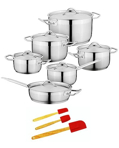 - 15pc Stainless Steel Cookware set is made of durable 18/10 stainless steel with 1 mm of wall thickness and polished outside finish. Practical pouring rim for easy draining. 4-layer capsule base for a lifetime of cooking perfection. Stainless steel handles with a firm and safe grip with stainless steel cover. Suitable for all heat sources, including induction. Set includes: (6 1/4″) covered saucepan- 1.7qt, (6 1/4″) covered casserole- 1.7qt, (7″) covered casserole- 2.6qt, (8″) covered casserole- 3.8qt, (10″) covered stockpot- 6.8qt, (10″) covered deep skillet- 2.6qt, and 3 spatulas