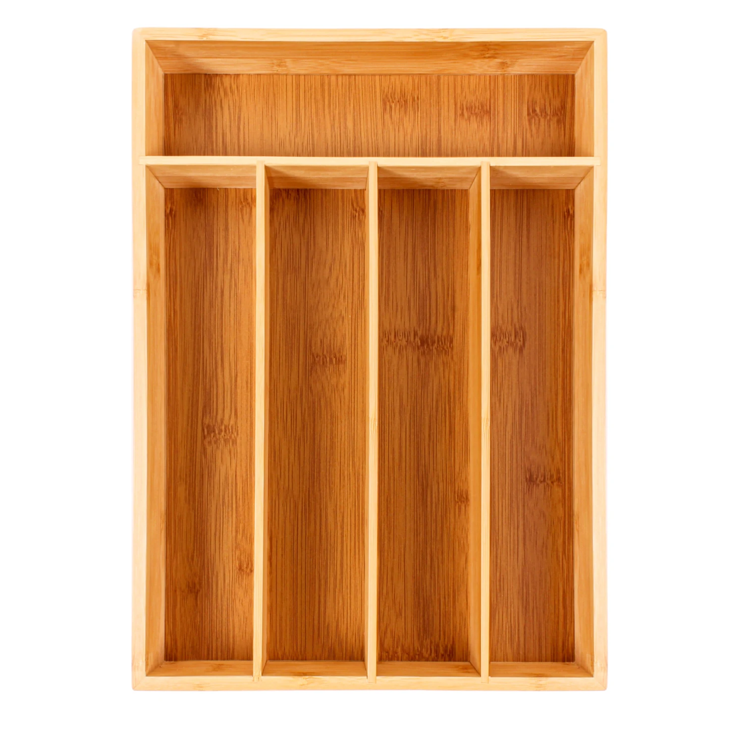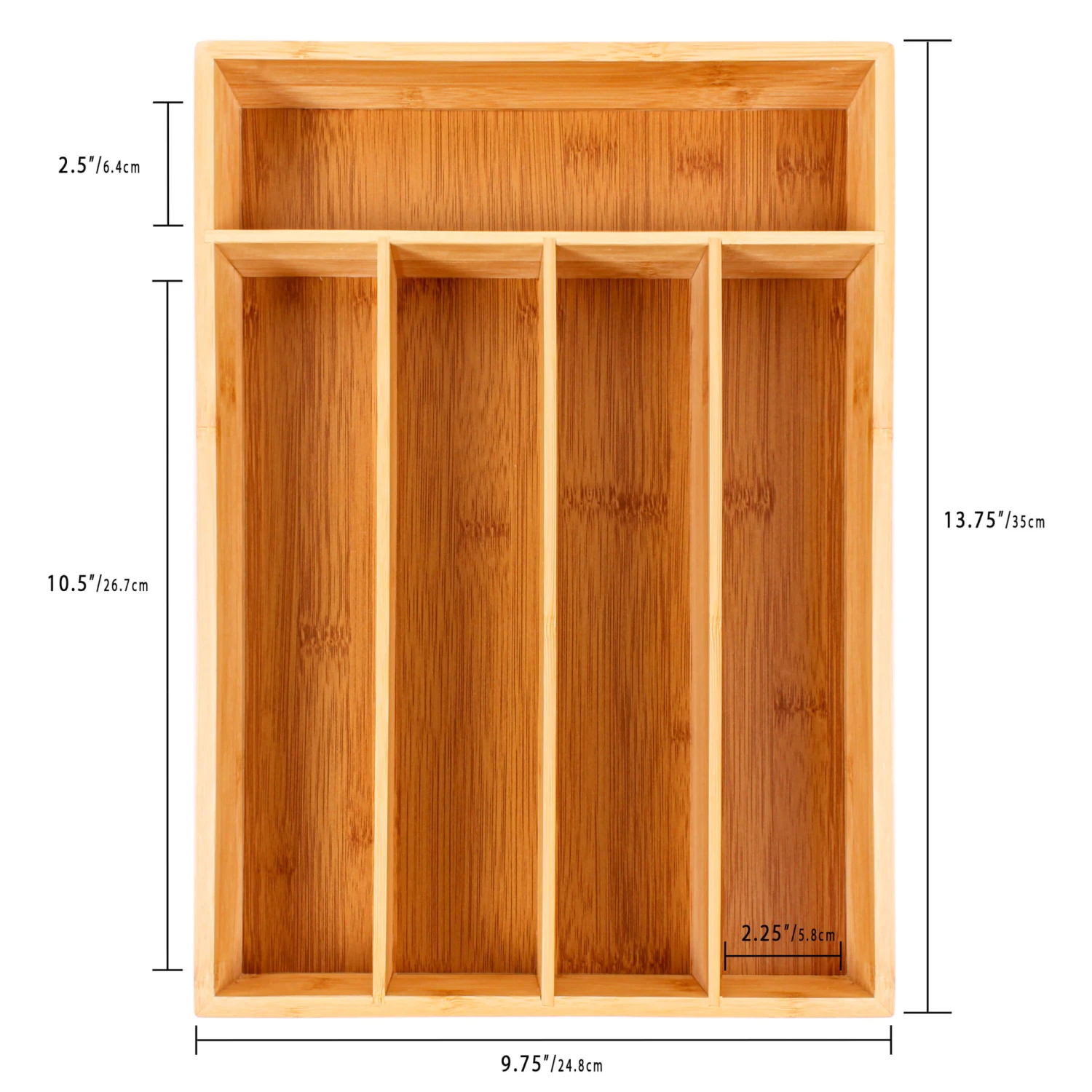5-Slot Flatware Organizer Features 5 built-in dividers to sort and organize place setting pieces; can be used in the kitchen for fork, spoon, knife, and gadget organization. All the right spaces for flatware in renewable bamboo. Designed to fit almost any kitchen drawer. Eco-friendly, and functional! 9.75″x13.75″
