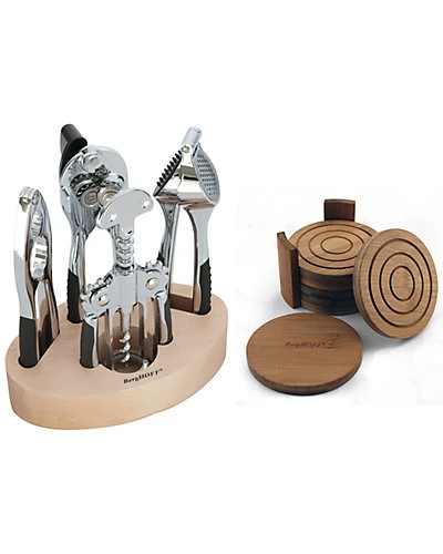 - Design details: Set Includes: 7″ nutcracker, 7″ can opener, 7″ corkscrew, and 7″ garlic press, 6pc coaster set with holder. Save space in your bar or kitchen and keep all your most used utensils within reach. The natural oak block of the 5pc Gadget Set houses a 7″ nutcracker, 7″ can opener, 7″ corkscrew, and 7″ garlic press and neatly showcases them without the clutter. Protect your furniture from water marks with this set of 6 coasters. These bamboo coasters create a contemporary design, but would also compliment any traditional home. Generously sized coasters made from renewable eco-friendly bamboo.