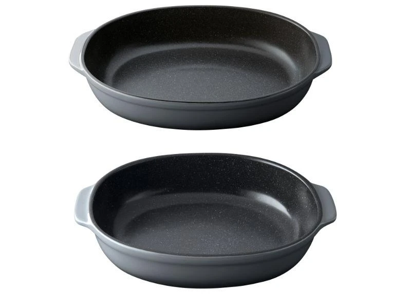 Bake, serve, store and reheat meals, you can do it all with these baking dishes! Whether you’re in the mood for a chicken pot pie or some freshly baked cinnamon rolls, just get out this stoneware beauty and slide it in the oven with the help of the convenient handles. The durable material with enamel coating makes sure your meal or snack bakes evenly, keeps it warm at the table and is a breeze to clean once you’ve finished those last bites. This dish is microwave, oven and dishwasher safe. This set includes 1x 16″ oval baking dish and 1x 13.2″ oval baking dish