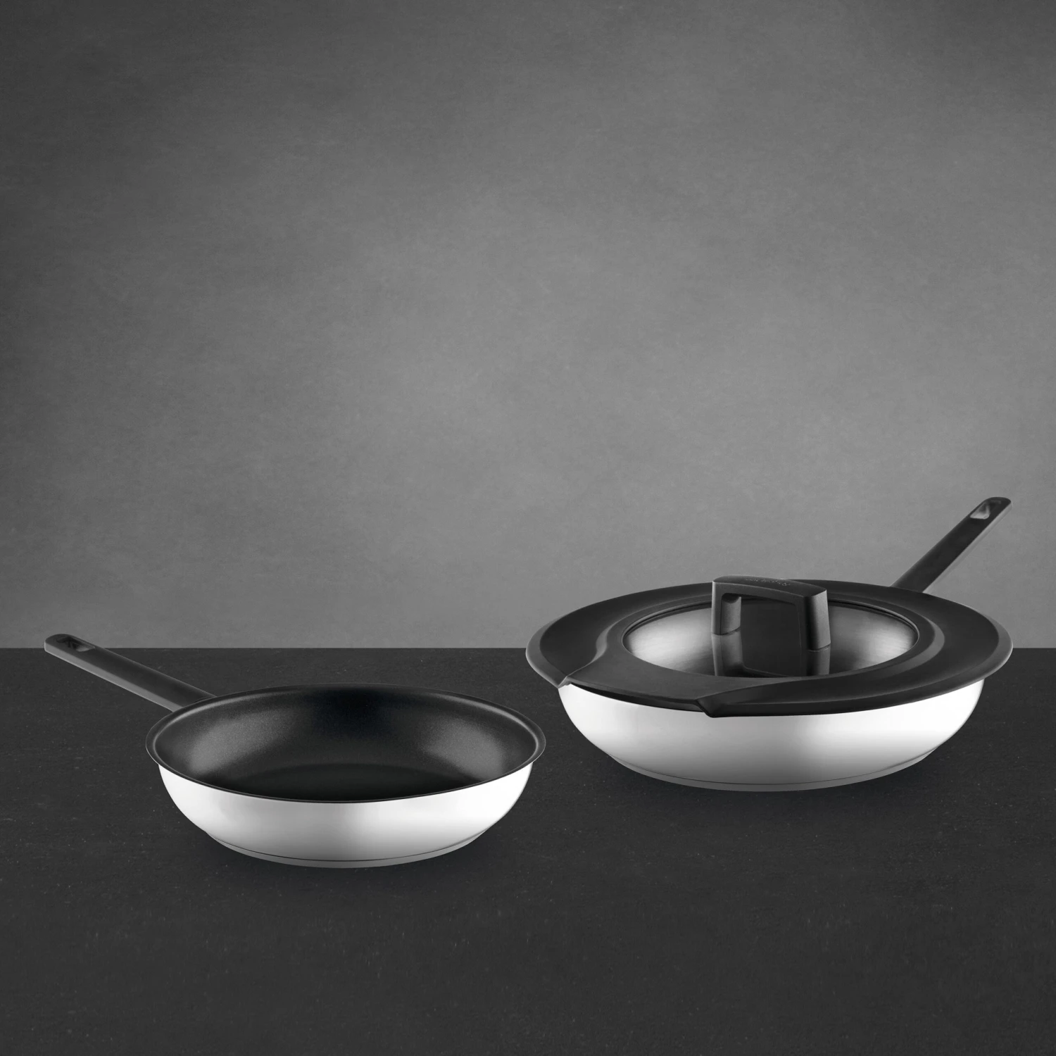 - Package includes: 18/10 Stainless steel Frying pan 11 inches, Frying pan 10 inches, 1x Universal Silicone Glass lid, Multicolored