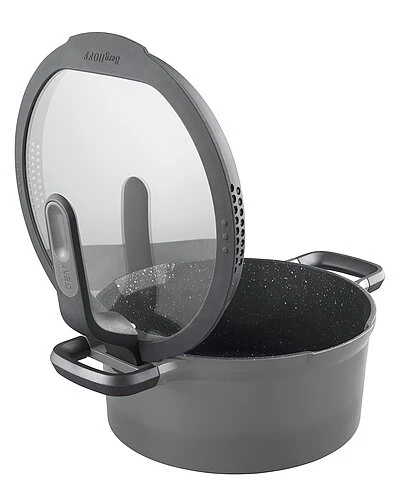- With a focus on style and practicality, this 8 inch casserole with stay-cool handles and a clear glass lid is a must-have in every kitchen. Just place it on any kind of stovetop and cook with little to no oil thanks to the multilayered non-stick coating that ensures an easy food release. When you use the casserole to boil potatoes, vegetables or pasta, youll no doubt appreciate the special pouring rims and the lid that features two different sized pouring areas for precise straining of all kinds of ingredients. An added bonus is that the lid can be positioned vertically on the body of the pot so youll always have a free hand to stir and serve. Red Dot Award winner for product design.