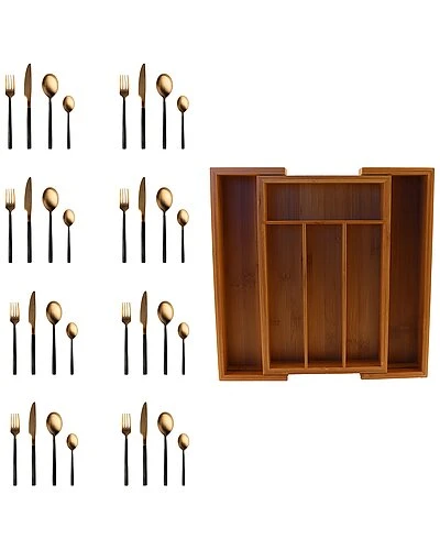 - Whether you want to give your dinner table a little touch of glamour or youre looking for the perfect gift to offer at a wedding or a housewarming, you cant go wrong with this stylish black and gold-plated flatware set. The knife, fork, spoon and dessert spoon are each made of high-quality 18/10 stainless steel thats dishwasher safe so after youve enjoyed a lovely dinner you can let the dishwasher take care of the clean-up. Then neatly put all the pieces away in your drawer using the included bamboo organizer. Service for 8.
