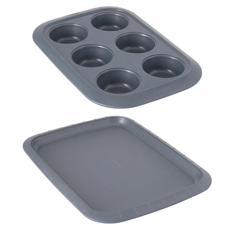 This Gem bakeware set includes one small cookie sheet and one six-cup cupcake pan. Make a delicious chocolate cake, banana muffins, a crusty loaf of bread or a crispy pizza. These conjure up all kinds of tasty treats with the carbon steel Gem bakeware! These ingenious bakeware items ensure an excellent result every time, thanks to their functional features including lightweight carbon steel, a high-end, non-stick coating. The icing on the cake? The grid lines are perfect for portion control!