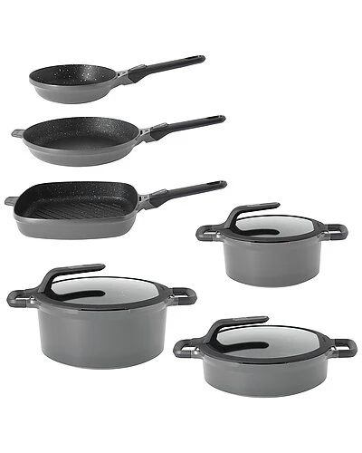 - BergHOFF’s Gem Stay Cool cookware are crafted with an aluminum body, triple layer base, and high-end multi-layer non-toxic, PFOA free, Fernogreen nonstick coating. This cookware provides an optimal cooking experience with the additional benefit of stay cool ergonomic handles that are removable (on fry pan/saute pan/grill pan), convenient integrated pouring spout that allow for dripless pouring, lids that accomodate straining of liquids, and lids that can be positioned vertically on the body of the pot to allow condensation to flow back into the pot instead of on your stove/countertop. The Gem Stay Cool 9pc Set includes one 10″/5qt covered stock pot, one 11″/7.7qt covered stock pot, one 11″/4.9qt covered 2-handled saute pan, one 8″ fry pan, one 11″ fry pan, and one 11″ grill pan. Easy release of even the most delicate foods. A healthy option for those looking to minimize the use of added fats and oils during meal prep. Suitable for all cooktops including induction, ceramic, glass, electric, and gas. Allow cookware to cool completely before attempting to clean. Grill pan and fry pan easily can go from stovetop to the oven; just press the botton and remove the handle from the fry/grill pans prior to transferring to the oven. Saute pans, casseroles, stockpot not for use in the oven. For use with silicone, nylon, or bamboo utensils only. Handwash recommended with warm water and mild detergent; avoid cleaners that contain bleach and citrus extracts. Use a soft sponge or dishcloth to clean the surface; Avoid scouring pads and other abrasive materials. If you stack your cookware to store, be sure to place a proper sized dish towel or silicone protector pad between each pot to avoid the scratching of the surfaces of your pots/pans.