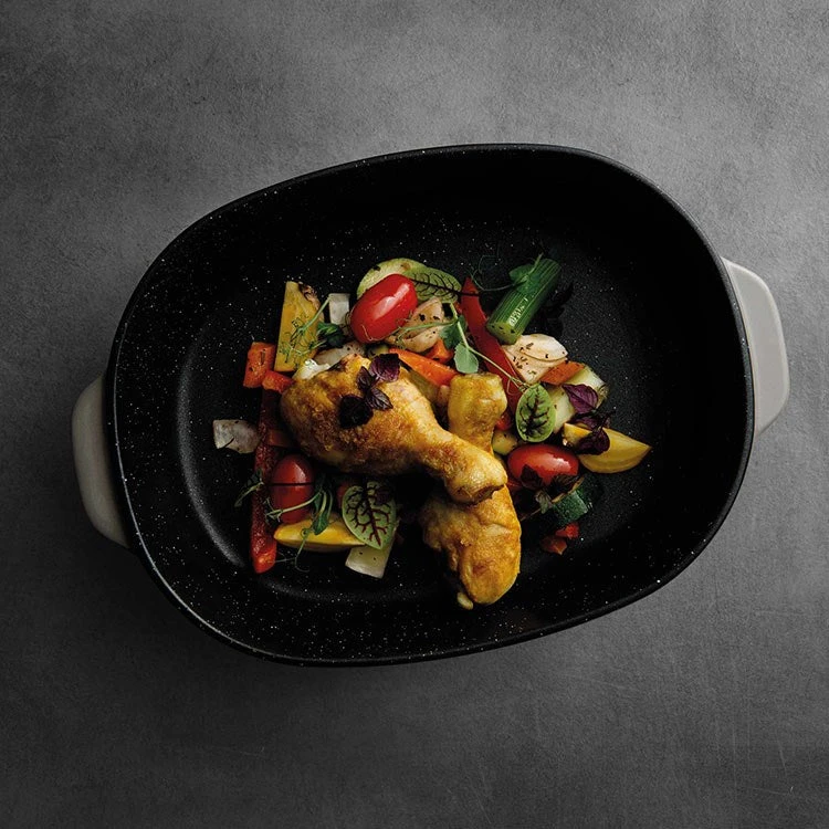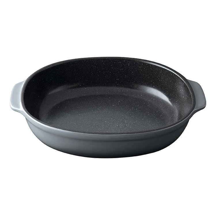 A classic potato gratin, a comforting winter casserole or a strawberry bread pudding, it all tastes equally good when you bake it in this oval baking dish! Equipped with wide handles for an easy grip and a non-stick coating that ensures easy food release and effortless cleaning, this black stoneware dish is stylish enough to go straight from the oven to the table and durable enough to last for years to come.