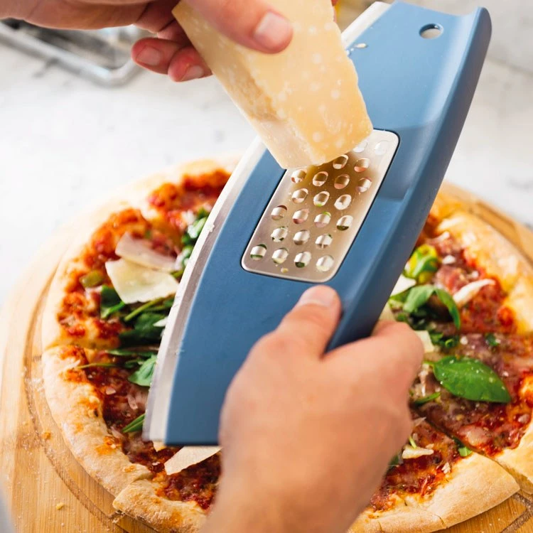 The Leo pizza slicer delivers two functions in one. The blade allows you to easily slice thin or thick crust pizzas while the integrated grater finely grates your cheese.