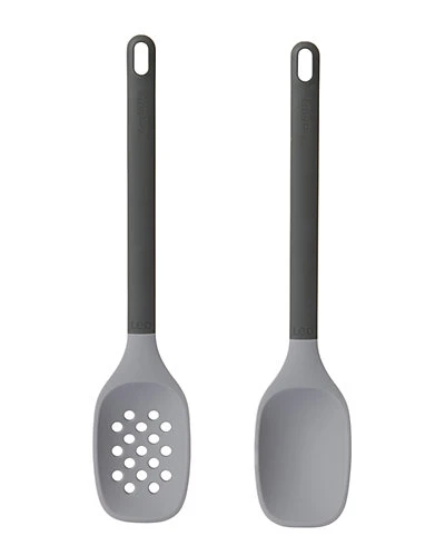 - Design details: Includes: Leo Grey Serving Spoon and Skimmer. Serving spoon, Serve up mashed potatoes, rice or stews in a jiffy with the Leo serving spoon! The heat-resistant silicone spoon wont scratch your delicate cookware while the soft-touch rubber handle ensures a comfortable grip when youre scooping up your ingredients. When youre done eating, just put the spoon in the dishwasher together with your pans and use the hanging loop for convenient storage. Skimmer, From pasta to peas, the Leo skimmer with silicone body is the perfect tool to skim and strain liquid from your pots and pans without scratching the delicate surface of your cookware. The soft-touch rubber handle ensures a comfortable grip and has a convenient loop so you can hang the skimmer from a hook alongside the other Leo utensils for easy access.