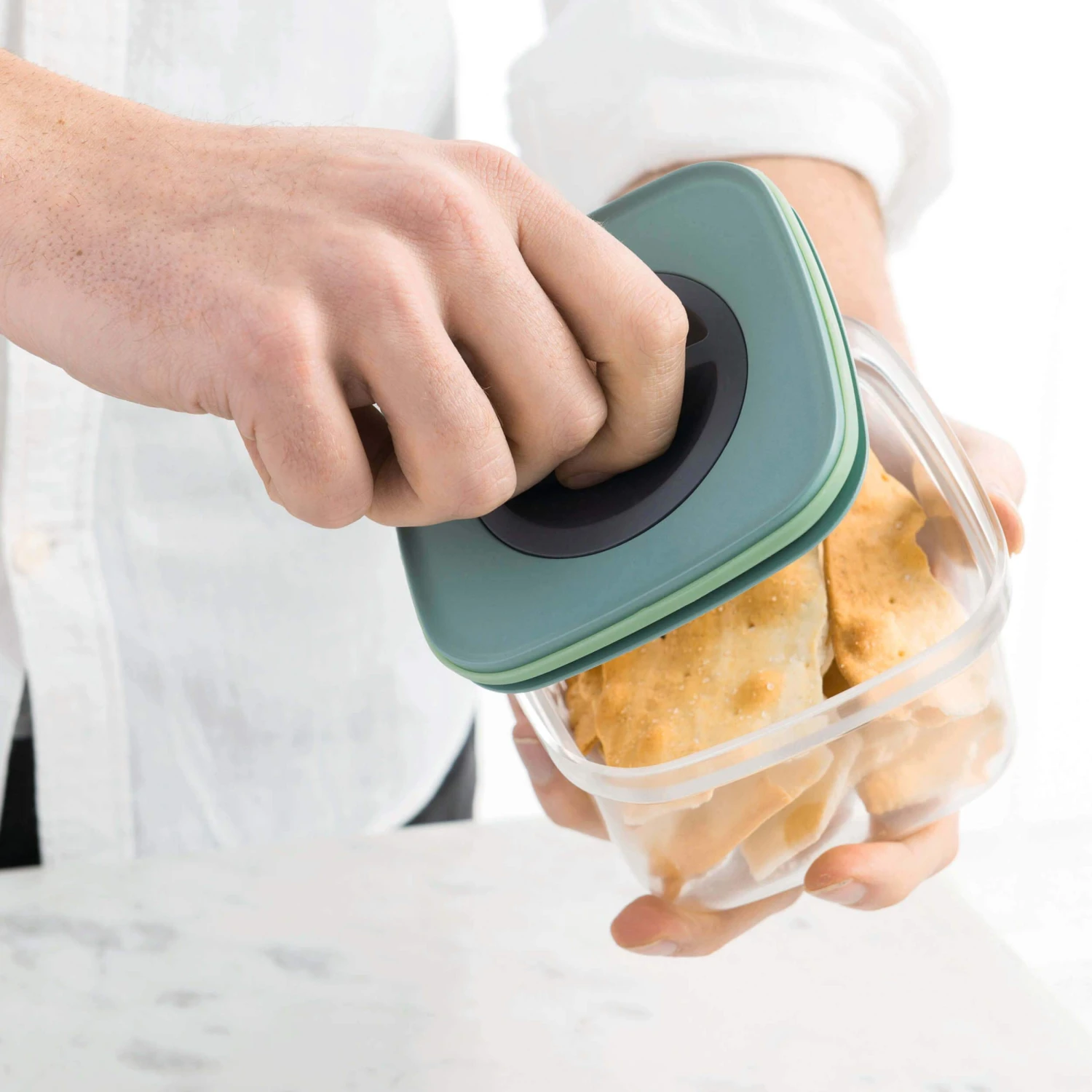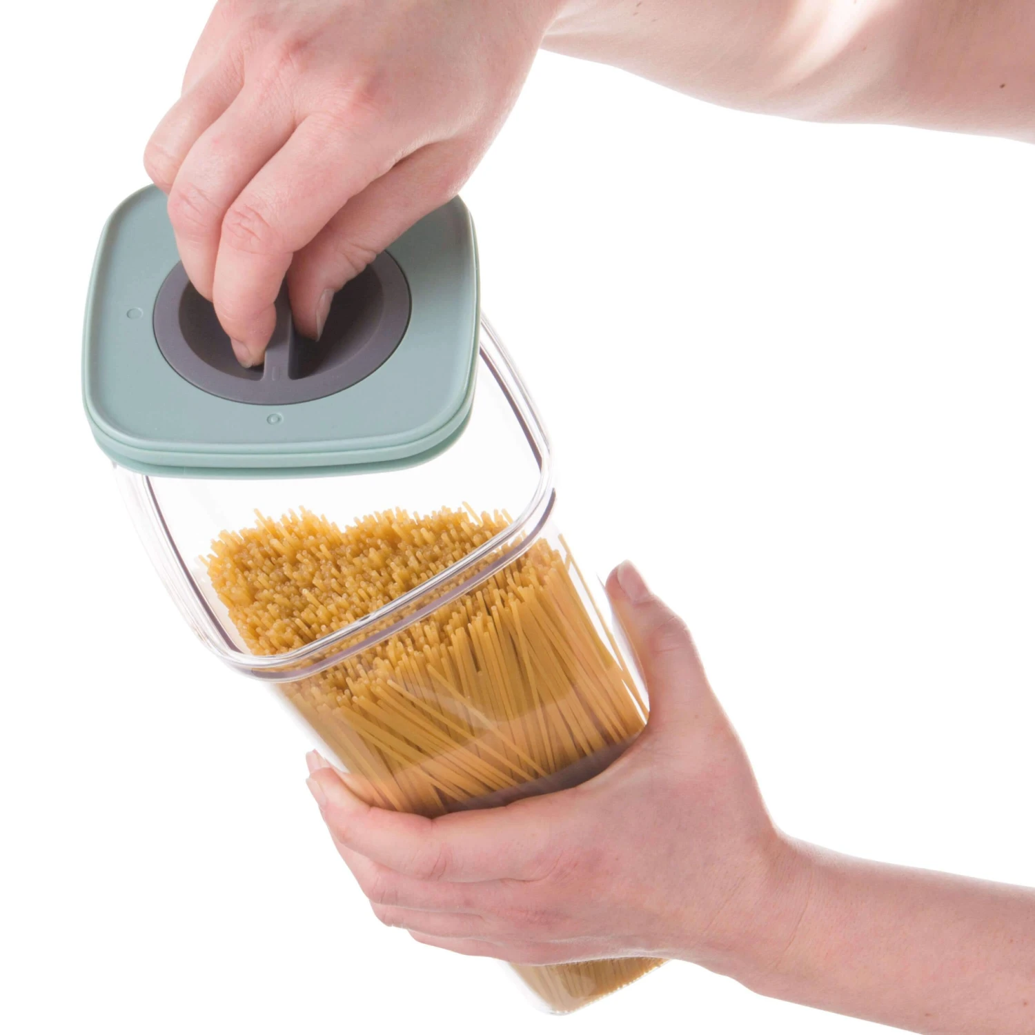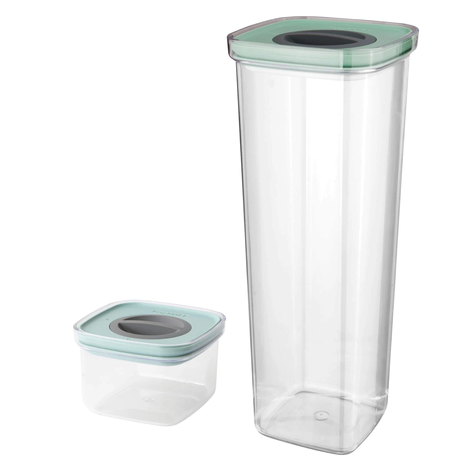 A must have to organize your pantry, these clear organizers allow you to always keep an eye on what is in each container. With the smart seal top you can always ensure that the contents stay fresh. With a simple twist of the one-touch dial you open the slim lid to fill the practical container with carrot sticks, sunflower seeds, raisins. When you’re done, just seal the lid tight and put it in your bag or stack in it your pantry for space-efficient storage. Set Includes: 2.2 Qt and 0.42 Qt Smart Seal Containers.