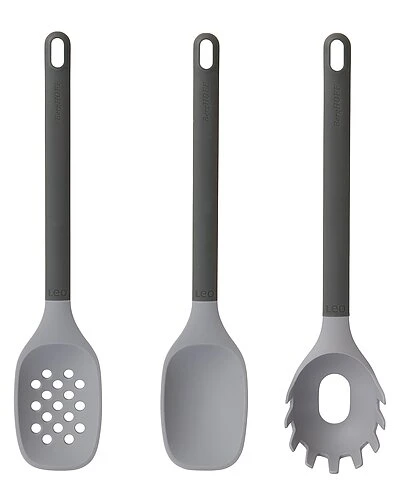 - Serve up mashed potatoes, rice or stews in a jiffy with the Leo serving spoon! The heat-resistant silicone spoon wont scratch your delicate cookware while the soft-touch rubber handle ensures a comfortable grip when youre scooping up your ingredients. When youre done eating, just put the spoon in the dishwasher together with your pans and use the hanging loop for convenient storage. A traditional spaghetti Bolognese, a creamy spinach tagliatelle or a delicious prawn linguine, it all starts with the right tool to handle your pasta. The Leo pasta spoon helps you to measure a good serving size of pasta and easily lifts out the cooked noodles without scratching your pans delicate non-stick coating. Skimmer, From pasta to peas, the Leo skimmer with silicone body is the perfect tool to skim and strain liquid from your pots and pans without scratching the delicate surface of your cookware. The soft-touch rubber handle ensures a comfortable grip and has a convenient loop so you can hang the skimmer from a hook alongside the other Leo utensils for easy access. Set comes with 12.75in serving spoon, 12.25in pasta spoon, 12.75in skimmer