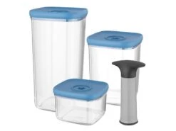 Homemade cookies, a crisp salad or ground coffee beans, with these practical and stackable food containers, you can easily keep it all fresh and tasty! Thanks to the user-friendly vacuum pump, your food is sealed airtight and leak-proof for maximum freshness and optimal preservation of flavors and aromas. This stackable food storage system is dishwasher safe and comes complete with the vacuum pump and 3 containers (4.5×4.5×3.25 0.63qt, 4.5×4.5×6.5 1.4qt, and 4.5×4.5×9.75 2.1qt).