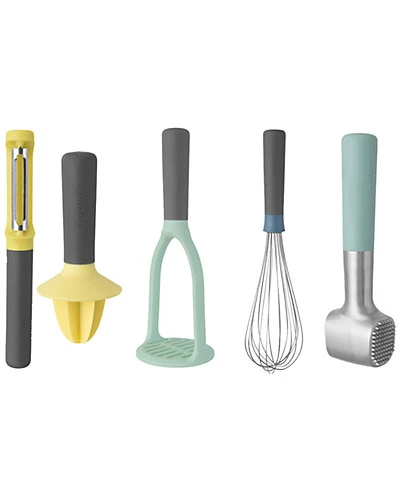 - Set Includes: Straight peeler, hand juicer, potato masher, whisk, and meat hammer. This set includes all the helpful tools that are essential for every kitchen. All these tools feature soft touch handles for a comfortable grip, and the soft colors will compliment any kitchen.
