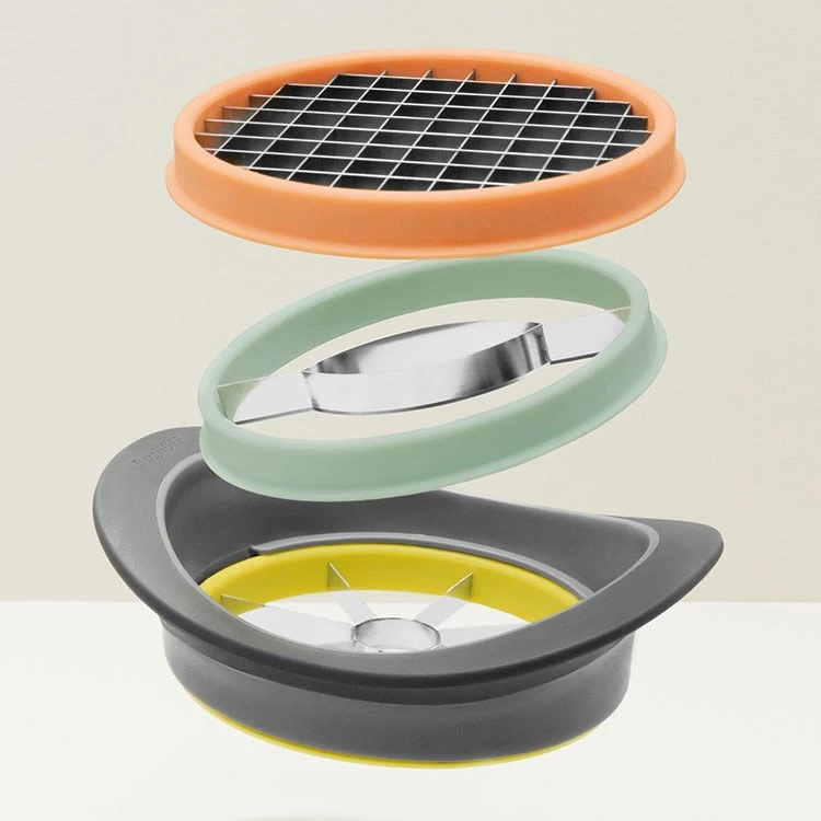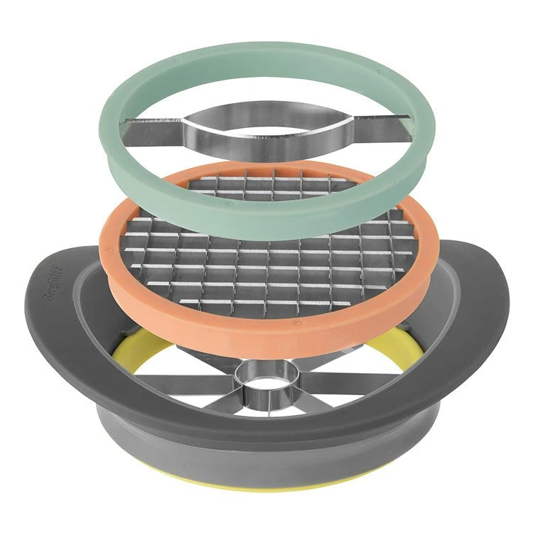 The Leo all-in-one slicer is a beautifully designed slicing tool for fruits and vegetables. Its sharp interchangeable blades core, slice and dice apples, mangos, potatoes with one simple press.