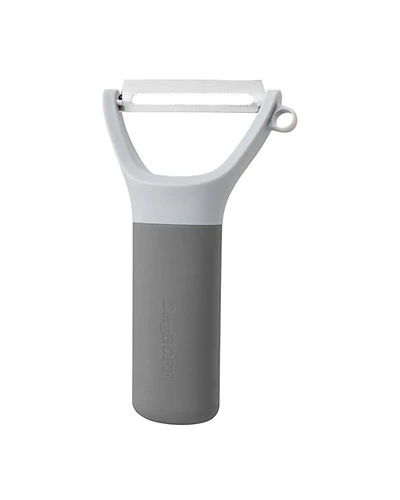 - Design details: Peaches, plums, tomatoes, zucchinis and more, youll easily tackle those tough-skinned fruits and vegetables with this serrated Y-peeler. The sharp stainless steel blade removes the skins effortlessly while the ergonomic soft-touch handle is a pleasure to hold and allows for a secure grip.