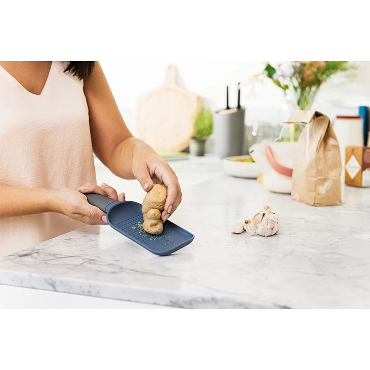 The Leo cut and grate set includes an herb cutter, a grater, and a cutting board. The convenient herb cutter is designed with two functions. Not only does it efficiently cut your herbs with a delicate rocking motion, but there are three different sized holes right on the cutter that are designed to perfectly strip stemmed herbs of all kinds! The included board pairs with the cutter. Plus, the textured surface makes it simple and effective to grate ginger in just seconds! First-rate for garlic too. The silicone ring on the base offers stability while grating. A quick rinse is sufficient to clean this grater.