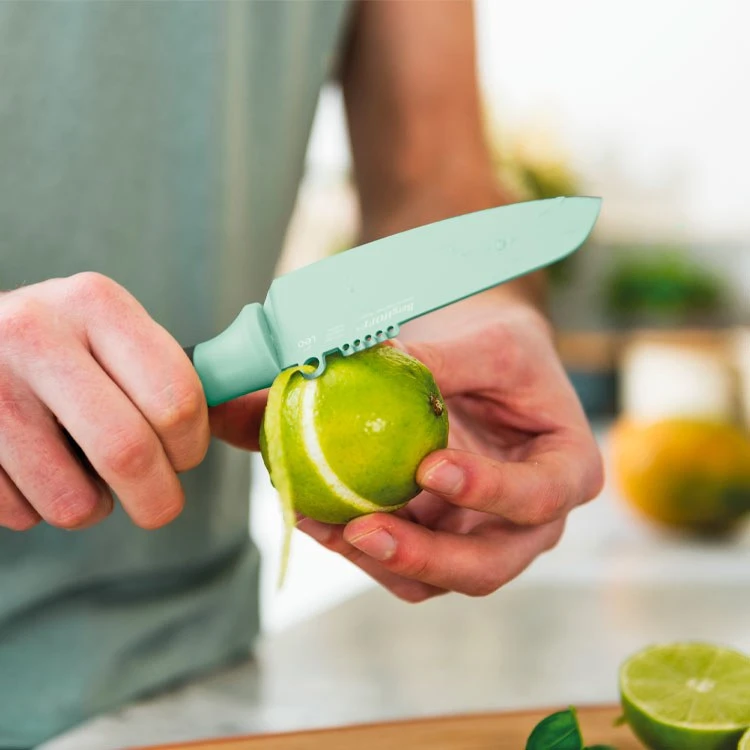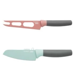 Cabbage, salad, eggplants, you name it, the Leo vegetable knife will help you to slice, dice, chop, or trim it. The Mint-colored blade with non-stick coating glides right through all kinds of vegetables while the integrated zester allows you to add a fruity touch to your dishes as it zests limes, lemons and other citrus fruits with minimum effort. The knife comes with a protective sleeve for safe storage. Having a wine and cheese night with the girls? The Pink Leo cheese knife is the perfect assistant to help you cut and serve a selection of delicious cheeses. The stainless steel blade cuts through hard cheese but is also fit for soft cheese that won’t stick to the blade thanks to the cut out sections. Once you’ve sliced the cheese, use the convenient fork-tipped spear for serving. The two-piece set includes a Leo Mint vegetable knife with zester and a Pink cheese knife.