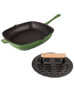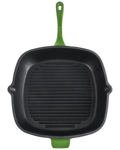 - BergHOFF’s Neo Enameled Cast Iron is built to last for years to come. Crafted from durable cast iron with an enameled body this cookware heats up evenly and stays hot longer. The ergonomic handles provide a secure grip. The 2pc cast iron grill set includes one green 11″ square grill pan, and one black slotted steak press. Cook like a pro and use the 11″ grill pan with steak press to create homemade paninnis, meaty steaks with the perfect grill marks, delicious burgers and chicken breasts grilled to perfection. The Neo cast iron cookware is suitable for all cooktops including gas, electric, ceramic, glass, and induction. Neo cast iron cookware is also oven ready. You can sear your food on the stovetop, and finish in the oven. Please allow cookware to cool completely before attempting to clean. Handwash recommended with warm water and mild detergent; dry thoroughly. Avoid cleansers that contain bleach or citrus extracts.