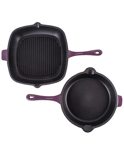 - BergHOFF’s Neo Enameled Cast Iron is built to last for years to come. Crafted from durable cast iron with an enameled body this cookware heats up evenly and stays hot longer. The ergonomic handles provide a secure grip. The 2pc cast iron grill set includes one purple 10″ fry pan, and one purple 11″ square grill pan. Cook like a pro and use the 11″ grill pan to create homemade paninnis, meaty steaks with the perfect grill marks, delicious burgers and chicken breasts grilled to perfection. The beautiful cast iron fry pan with its sturdy handle is another multipurpose tool in your kitchen arsenal. Use the fry pan to make succulent lamb chops, crispy bacon, and even a delicious cake. Fry pan has an integrated pour spout which allows you to easily drain any unwanted fat from the pan. The Neo cast iron cookware is suitable for all cooktops including gas, electric, ceramic, glass, and induction. Neo cast iron cookware is also oven ready. You can sear your food on the stovetop, and finish in the oven. Please allow cookware to cool completely before attempting to clean. Handwash recommended with warm water and mild detergent; dry thoroughly. Avoid cleansers that contain bleach or citrus extracts.