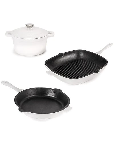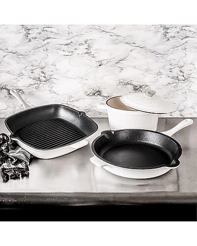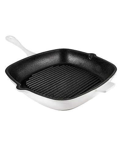 - BergHOFF’s Neo Enameled Cast Iron is built to last for years to come. Crafted from durable cast iron with an enameled body this cookware heats up evenly and stays hot longer. The ergonomic handles provide a secure grip. The 4pc set includes one white fry pan, one white 11″ square grill pan, and one white 3qt covered dutch oven. Cook like a pro with the versatile dutch oven that can go effortlessly from browning on the stove top to roasting in the oven. Braise short ribs, make hearty stew, three bean chili, curry chicken, and so much more. Use the 11″ grill pan to create homemade paninnis, meaty steaks with the perfect grill marks, and chicken breasts grilled to perfection. The beautiful cast iron fry pan with its sturdy handle is another multipurpose tool in your kitchen arsenal. Use the fry pan to make succulent lamb chops, crispy bacon, and even a delicious cake. Fry pan has an integrated pour spout which allows you to easily drain any unwanted fat from the pan. The Neo cast iron cookware is suitable for all cooktops including gas, electric, ceramic, glass, and induction. Neo cast iron cookware is also oven ready. You can sear your food on the stovetop, and finish in the oven. Please allow cookware to cool completely before attempting to clean. Handwash recommended with warm water and mild detergent; dry thoroughly. Avoid cleansers that contain bleach or citrus extracts.