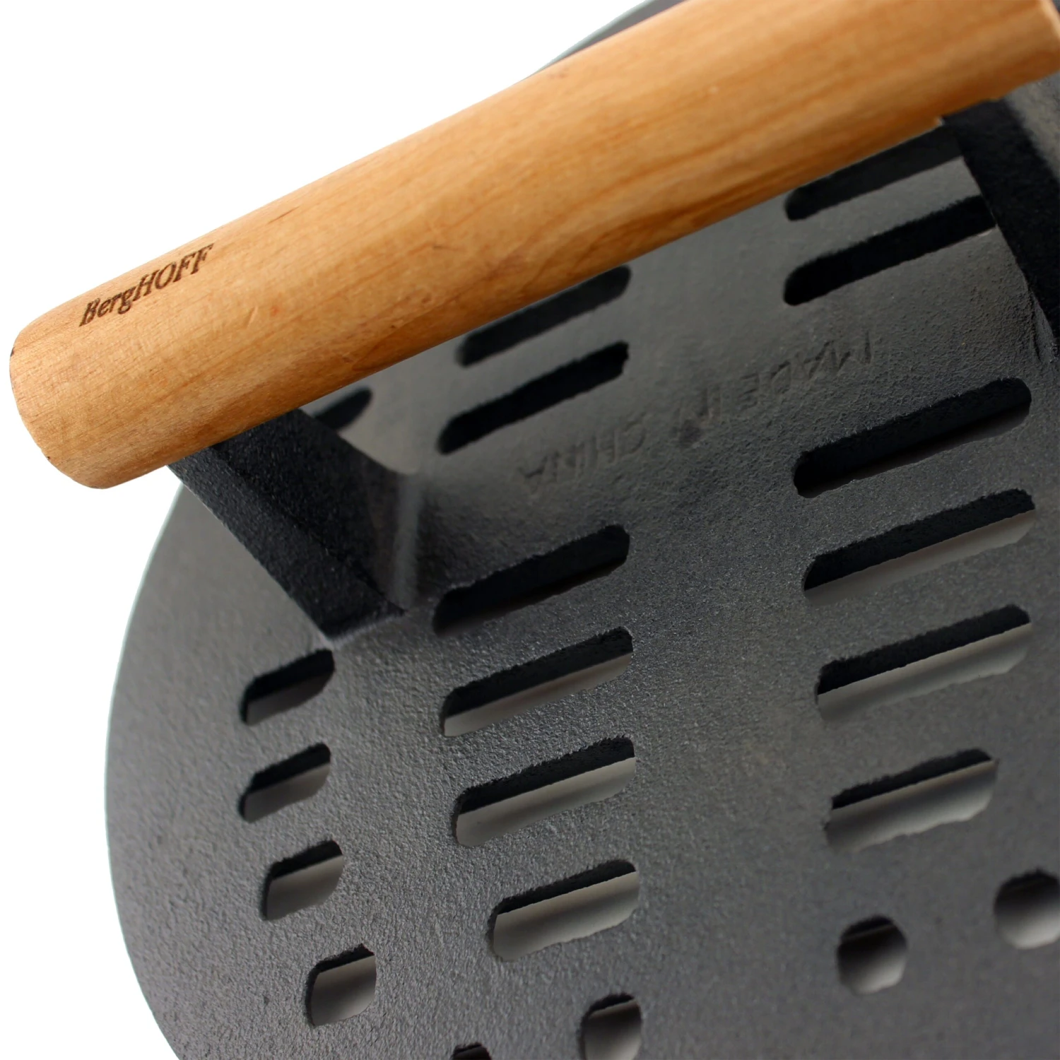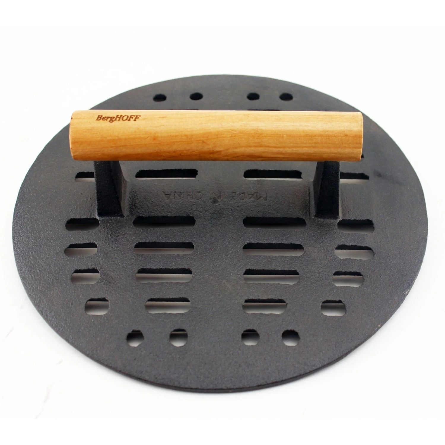 - Features: Cast Iron is best material for heat retention, steady and even heat ideal for slow-cooking, roasting, searing, stir-frying or baking. Smooth enamel interior resists staining and prevent sticking for easy food release and clean-up. Steak press with slotted base is perfect for bacon or steak that allows the oil to deeply penetrate the cast iron.