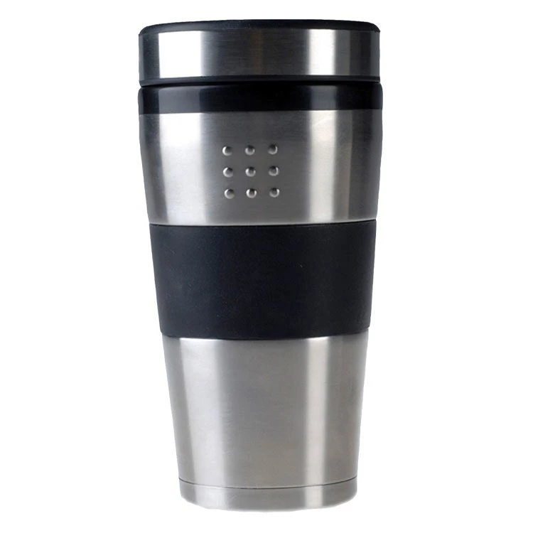 This Orion stainless steel travel mug features black durable plastic bands for an easy, stay-cool grip. The double-walled design keeps drinks hot or cold, and an anti-skid layer adds extra protection and prevents heat damage to surfaces. Designed to fit almost all vehicle cup holders.