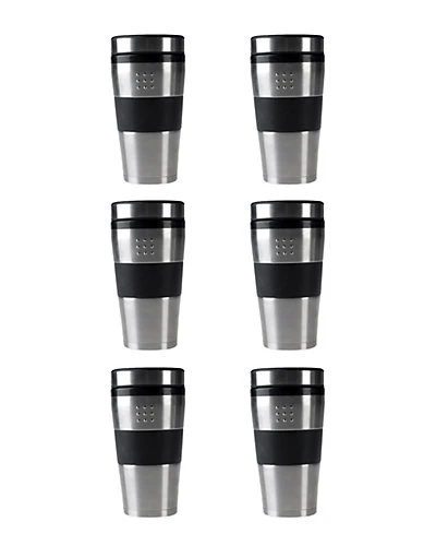- Set Includes: Six 16oz Stainless steel travel mugs. Styled with black durable plastic for an easy stay cool grip. Double walled to keep drinks hot or cold, and an anti-skid layer for extra protection and to prevent heat damage to surfaces. Designed to fit almost all vehicle cup holders.