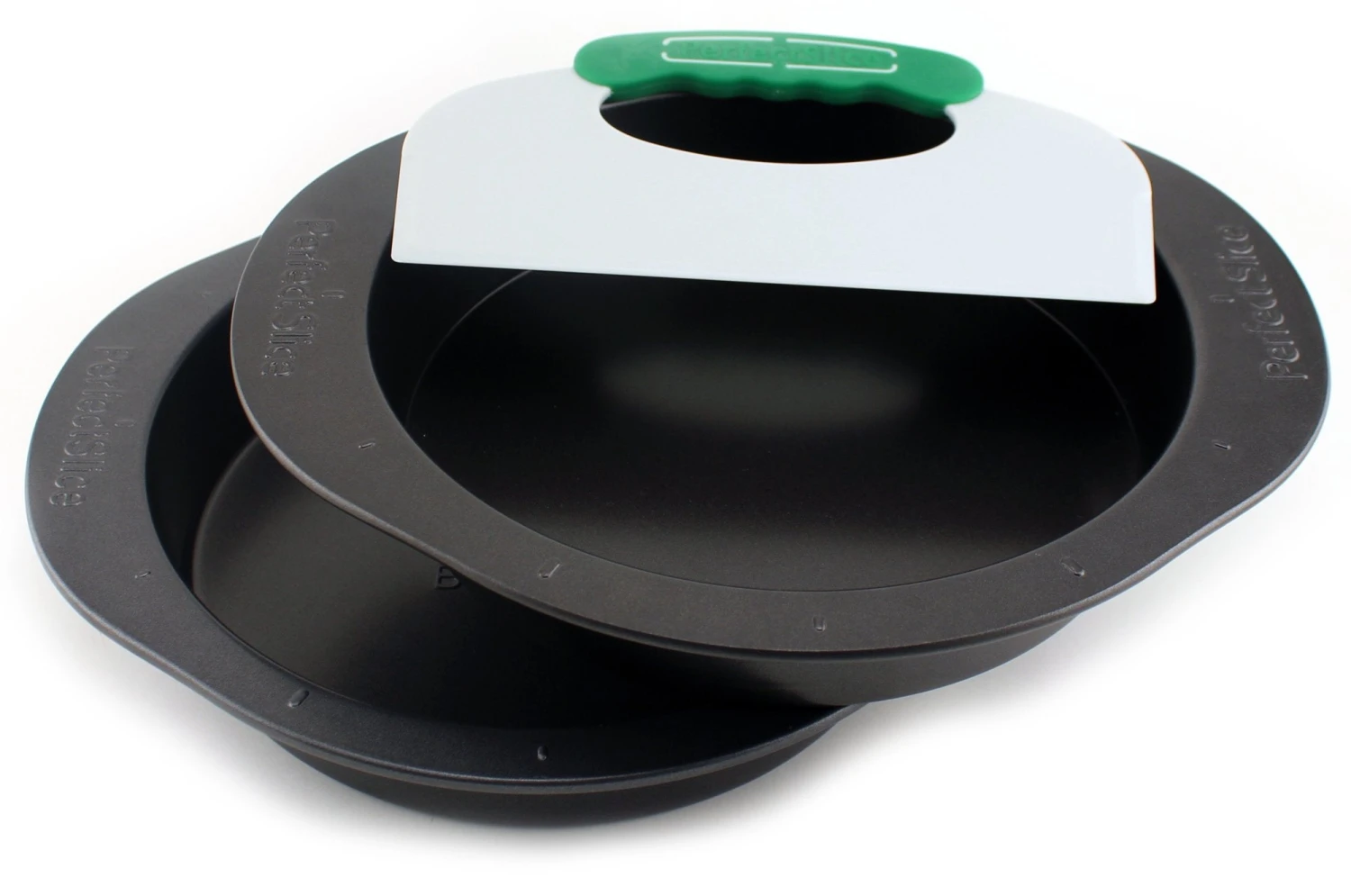 3 Pieces Round Cake pan w/tool set is more than quality baking pans; It’s also a convenient cutting system. The unique patented guideline grid around the outer edges of every pan allows you to simply line up an exclusive Perfect Slice cutting tool, and press down to create any portion size desired. Every slice is beautifully uniform. The cutting tool with silicone handle is tough enough to cut the cake yet won’t damage your pan.
