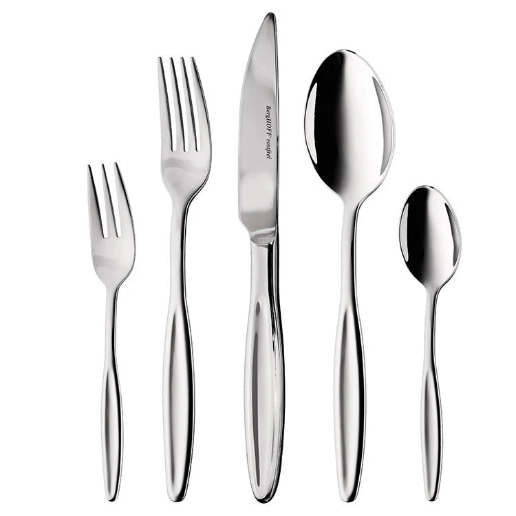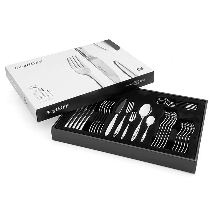Whether you’re having an everyday family dinner or setting the scene for a festive evening, the Ralph Kramer Folio flatware gives your table a smart touch. The graceful elongated collar creates a careful contrast with the wider handle and its shapely notch that accompanies your grip. Combining a sleek design with a pleasant feel, designer Ralph Kramer managed to create a complete set of stainless steel flatware that you’ll enjoy for years to come! The 30-piece set provides service for six guests and includes six knives, six spoons, six forks, six cake forks, and six coffee/tea spoons.