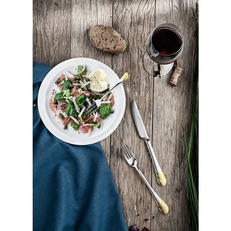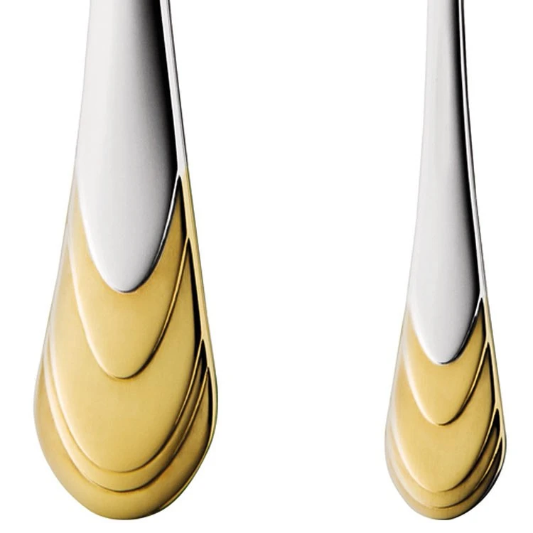 Looking for a set of flatware that will immediately catch the eye of your dinner guests? The Waterfall line comes with stunning detail and Gold-colored decoration on the handles that mirror the natural water flow. A subtle repetition of this fluent decoration on the collar creates a harmonious blend that feels great to the touch. With the Waterfall flatware, award-winning designer Ralph Kramer created a set of cutlery that simply breathes class. The 30-piece set provides service for six guests and includes six knives, six spoons, six forks, six cake forks, and six coffee/tea spoons.