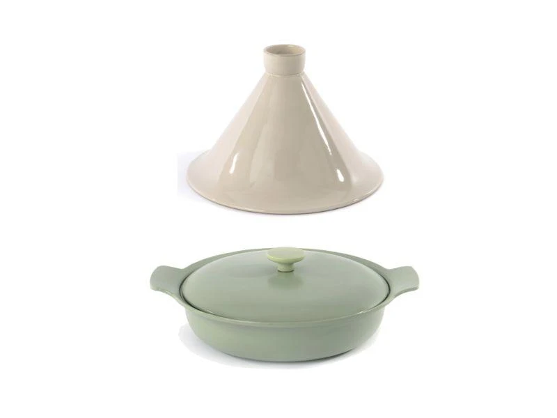 11″/3.5qt Green Covered Deep Skillet is made of Cast iron which has great heat retaining abilities: itβs the perfect choice for slow cooking and for hearty stews prepared in the oven or on the stovetop. The cover locks in the moisture and small bumps on the interior make sure the evaporated juices are directed on to the food for extra tasty results. Only little oil is needed with this pan: the perfect option for low-fat frying. Wide handles for a safe grip, even when wearing oven mitts or using potholders. 11.5″ White Tajine cover to fit the 11″ cast iron deep skillet from our Ron collection. Turn the deep skillet into a tajine, perfect for real slow cooking and all traditional dishes. Traditional cone shaped lid, allowing the steam to re-condense into water droplets which fall back onto the ingredients for tender, moist results. Elegant design for stove top and oven to table use. Oven safe