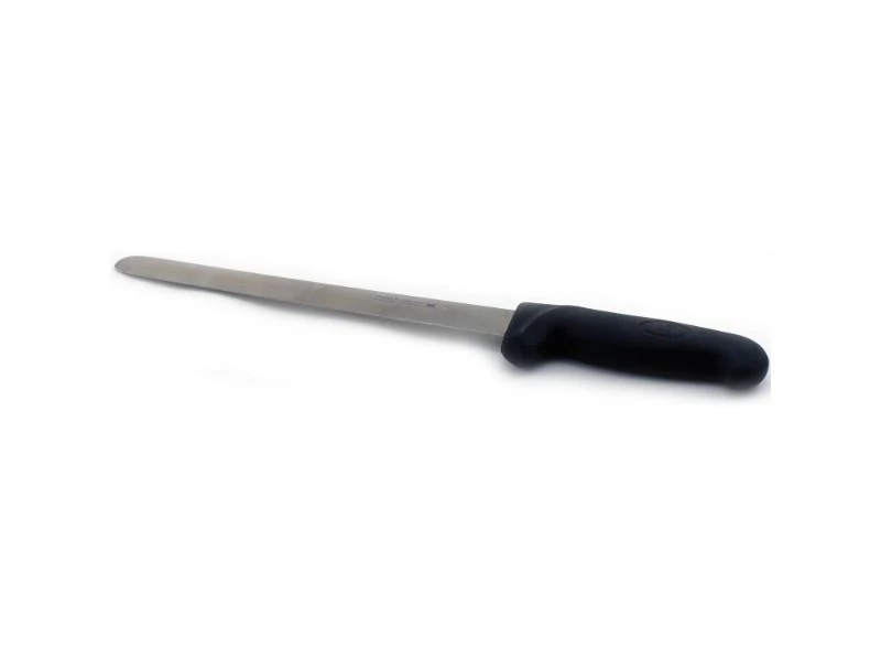 12″ Salmon/Ham Slicer is made from high quality, ice hardened stainless steel, these knives feature ergonomically designed black, soft grip, thermo plastic handles. Easily sharpened and holds their edge well. The handle is safe, high impact, slip resistant as well as antimicrobial and micro-organism safe. The knife is and low temperature resistant and safe to use in the freezer.
