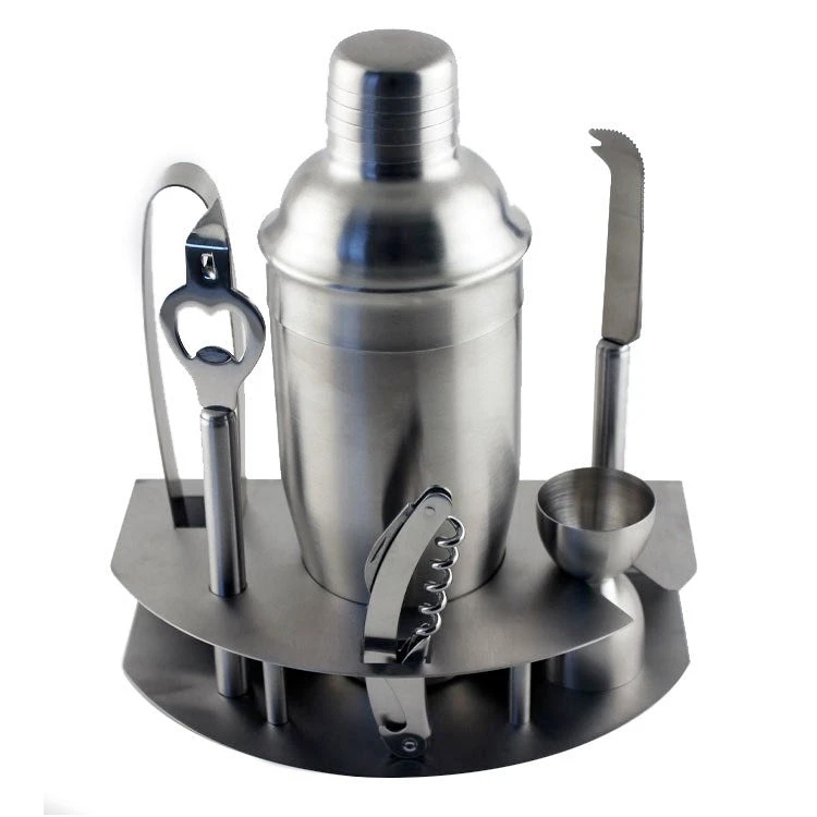Ensure that you are ready for any drink preparation with this Studio seven-piece bar tool set. This stainless steel set features a bottle opener, a corkscrew, tongs, a bar knife, a shaker, and a polished oval stand. The sleek style makes it an attractive addition to any bar.