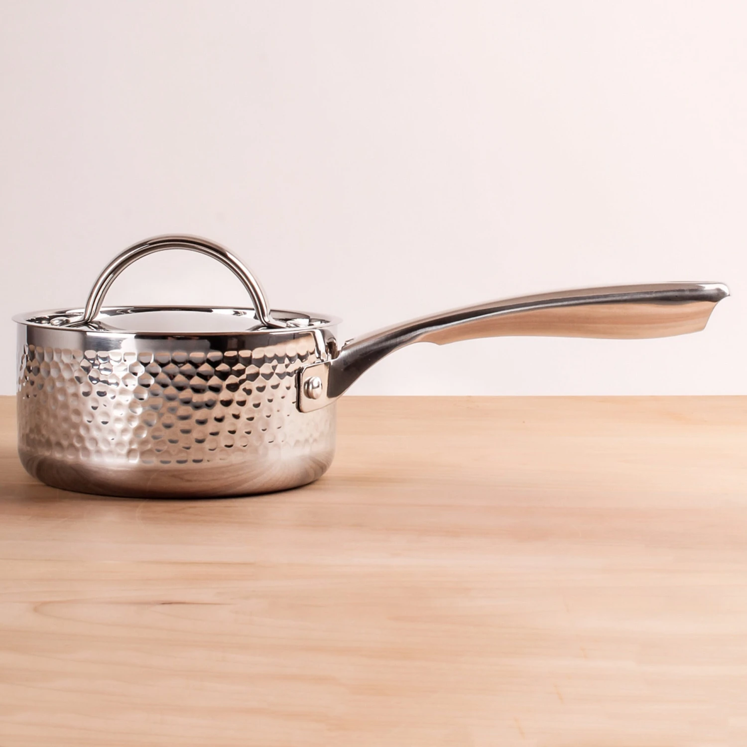 This tri-ply stainless steel hammered saucepan is a jewel in the kitchen. Not only will this saucepan distribute heat evenly and adequately, but it also looks like a piece of fine art. Mixing a decorated hammering technique with modern design, this sauce pan is nothing short of excellence.