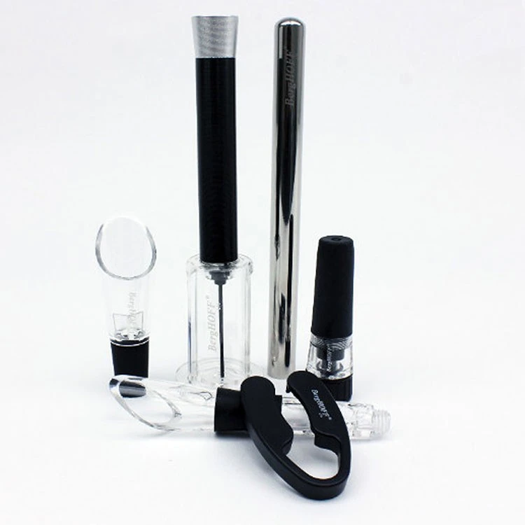 Taste the difference with this unique wine opener set by BergHOFF. This essential box set designed for wine enthusiasts features a foolproof air pump opener, a foil cutter, a stopper, an aerator pourer, and a chiller pourer. This set is your one-stop-shop for all of your wine needs.